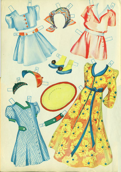 This page of clothing includes a rather matronly looking dress in my humble opinion. There is also a short white dress with yellow trim, with matching hat and shoes and socks. There is a nice dressy coat with gloves and belt and a flower at the shoulder. And I really like the dress at the bottom with the red short sleeved jacket over it with matching red hat. Super Cute!