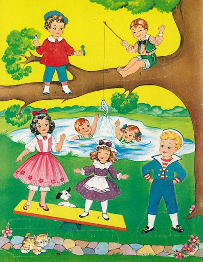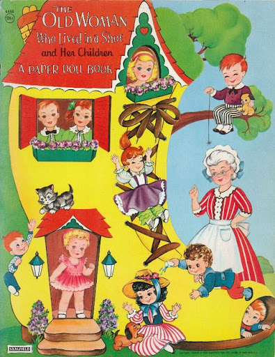 The Old Woman Who Lived in a Shoe is an adorable set of paper dolls. These are based on the nursery rhyme we all sing sang as children. This set is from Saalfield Publishing and I believe are from the 1960s.