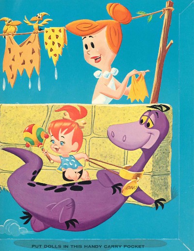 And here is Wilma doing laundry and watching Pebbles ride the original purple dinosaur, Dino. I always loved that not only were Betty and Wilma best friends, but so were Fred and Barney, and on top of that they were blessed to be next door neighbors! Ah, the perfect world of cartoons.